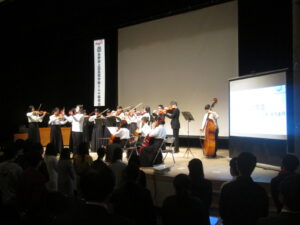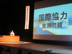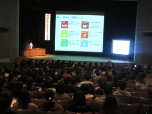写真1:開会行事(室内楽班校歌伴奏)、写真2:基調講演SDGs(JICA長野デスク)