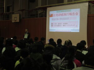 お知らせ 2018.03.21 お知らせ 3月20日(火)台湾研修旅行報告会 3月20日台湾研修旅行報告会が開催されました。 2年生発表を通じて1年生が台湾研修旅行について学びました。 スイス留学生との報告とSGH報告会優秀者の表彰式を実施しました。 前の記事へ 一覧へ戻る 次の記事へ TOP すべてのお知らせ お知らせ 3月20日(火)台湾研修旅行報告会