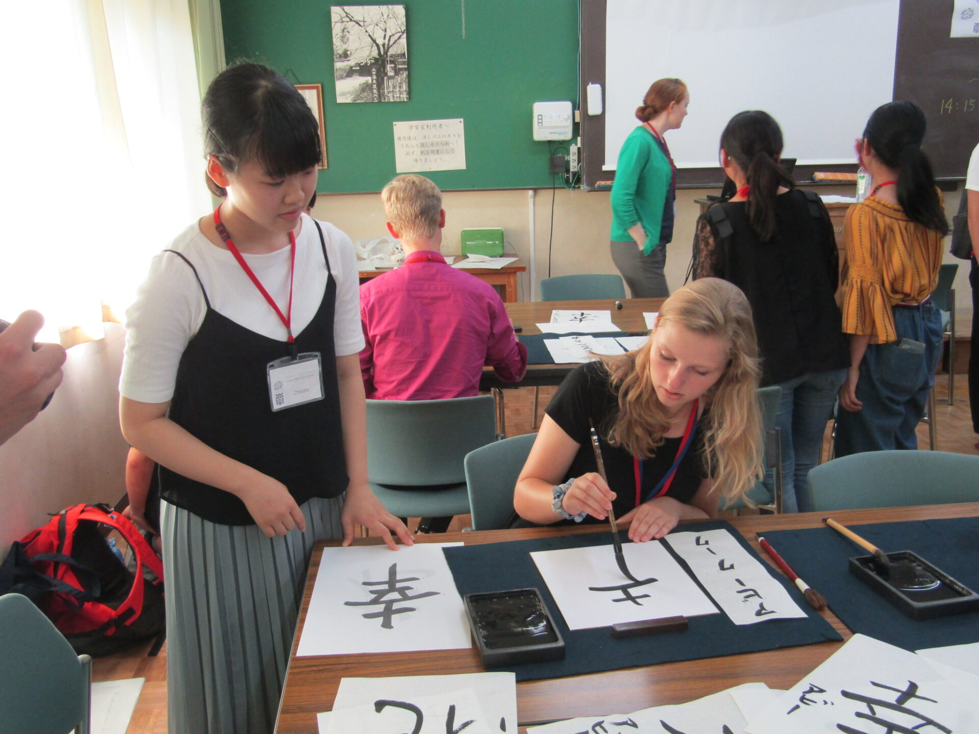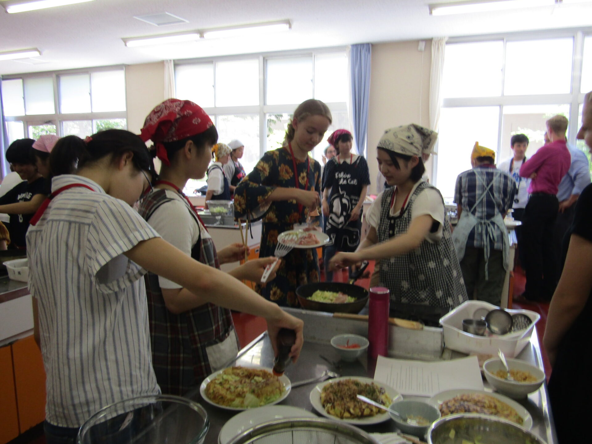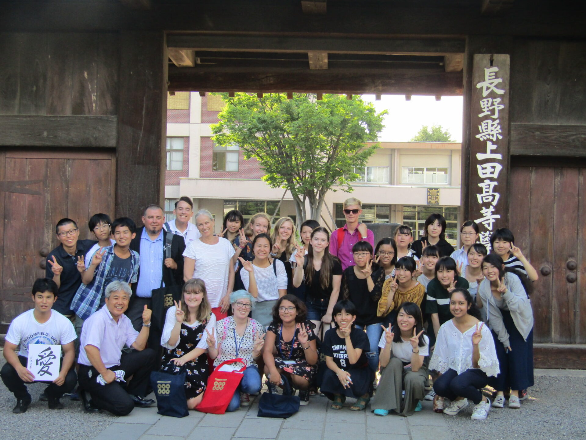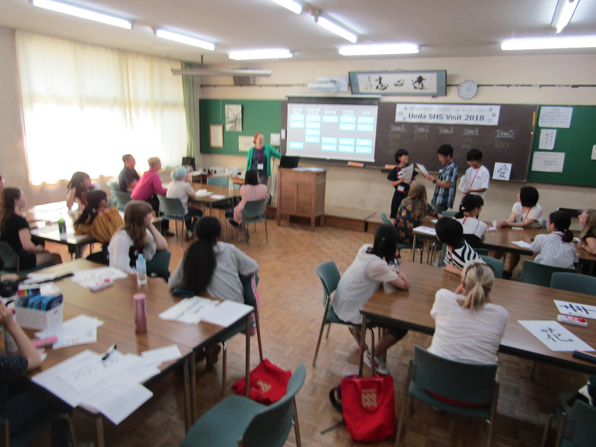 上田市の友好都市米国コロラド州ブルームフィールド市の高校生が訪れ、本校の生徒と交流しました。午前の開会セレモニー、学校紹介の校内ツアーに続いて、昼はお好み焼きランチを楽しみました。午後は、茶道、書道、弓道の体験を行った後、学校文化や上田市・真田氏の歴史について、上田高生が英語でプレゼンテーションをし、交流を深めました。