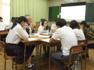 プレゼンターは10分間のプレゼンテーションの後、3分間の質疑応答と10名程度での約10分間のディスカッションに取り組みました。ディスカッションは分科会を2~3のグループに分けて行い、それぞれに本校OB・OGの大学生を含めた18名の助言者の先生方も加わりました。小集団ゆえに話しやすい雰囲気が生まれ、次第に笑いも漏れたりして、議論も盛り上がりました。
