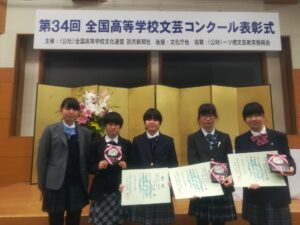 お知らせ 2019.12.16 お知らせ 12月14日(土)文芸班が第34回全国高等学校文芸コンクールで入賞しました。 全国高等学校文化連盟、読売新聞社主催の「第34回全国高等学校文芸コンクール」で本校文芸班3年生の中村瑠璃さんが文芸評論部門で優良賞を2年生の小宮山真央さんが短歌部門で優良賞を受賞しました。また、文芸誌部門でも、『松尾文藝 78号』が2年連続となる優良賞を受賞しました。 前の記事へ 一覧へ戻る 次の記事へ TOP すべてのお知らせ お知らせ 12月14日(土)文芸班が第34回全国高等学校文芸コンクールで入賞しました。