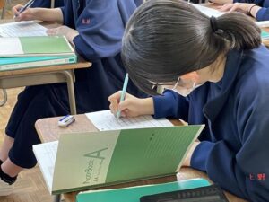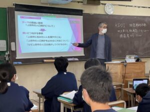 課題研究は大きな可能性を持つ教育活動ですが,そのテーマ設定に際しては,生徒も指導教員も,悩みが尽きません。今回は,昨年度来連携しているKDDI株式会社の協力を得て,地方創生推進部マネージャー横幕秀明さんが「課題研究テーマの見つけ方」として,1学年を対象に特別授業を実施して下さいました。横幕さんは課題研究の意義を説明するとともに,その過程で陥りがちな「課題大きすぎ問題」,「課題遠すぎ問題」,「課題見えない問題」を指摘,その解決策として「分解」を提案し,そこから問いを立てることや,その具体的方法を提案して下さいました。生徒たちは5月以来各自が集めてきた「ワクワク」から抽出したテーマをもとに,級友と相談しながら様々な問いを立てることに挑戦していました。