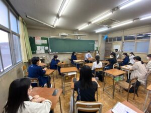 2年生は、来月行われる台湾とのオンライン高校交流に向け、台湾の看護人材育成や医療通訳育成を手がけるアジアンワイズの理事長 王珠恵さんのご講演を聞きました。台湾の歴史や文化、台湾の高校生活など、動画で実際の台湾の様子を見ることも交えながらお話しいただきました。日本と台湾のつながりを深く知ることができた、という感想や、高校生が2日間ロボットの赤ちゃんを育てる授業、上田高校と台湾の高校生の時間割の違いに驚いた、という感想が多く寄せられました。