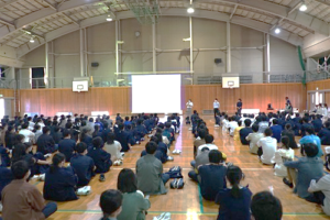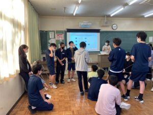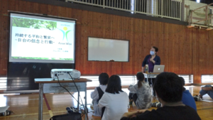 1年生はワークショップ「世界が百人の村だったら」をクラス単位で実施し、先輩ファシリテーターのリードのもと、年齢、性別、宗教、居住地域、言語などを記した「役割カード」を各人が持ち、様々なテーマ別に集団を作り、先輩の指導家で世界や国内の現実を疑似体験しました。その後の全体会ではJICA長野デスク国際協力推進員で、ウガンダでの青年海外協力隊を経験された木島史曉さん、フィリピンの貧困者支援に取り組んでいる、NPO法人ICANの直井恵さんに講演していただきました。お二人とも発展途上国支援の経験を踏まえ、グローバル課題の深刻さやSDGsに取り組むことの重要性を指摘されました。放課後の座談会では、昨年度「ヒューマンアクトインマニラ」に参加した2年生も加わり、生徒自らの研究テーマとグローバル課題に関する議論でも盛り上がりました。