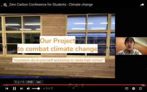 2月22日〜25日に国際学生ゼロカーボン会議がZoomウェビナーで開催され、1年生の桑田彩芭さんがプレゼンターとして出演しました。長野県、カレリア応用科学大学、東フィンランド大学、リベリア林業学校、ENO Schoolnetが主催するこの会議では、気候変動や環境問題に関心のある長野県内の高校生・大学生と海外の高校生や大学生が取組発表やテーマごとの意見交換を行い、4日間で40カ国以上、約1200名の参加があったそうです。第1日目には、気候変動をテーマに日本、スペインから学生による取組発表が行われました。会議の実行委員メンバーの一人でもあり、12月に教室の断熱DIYを企画した1年生の桑田彩芭さんがワークショップの様子やこれまでの取組みについて学生プレゼンターとして英語で発表を行いました。