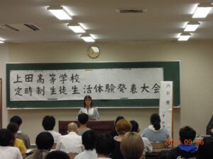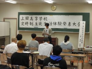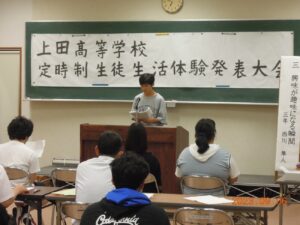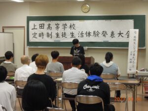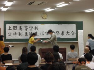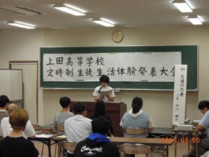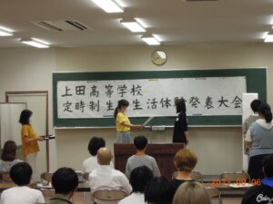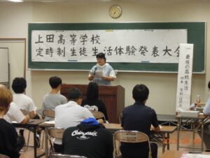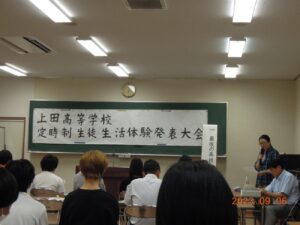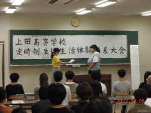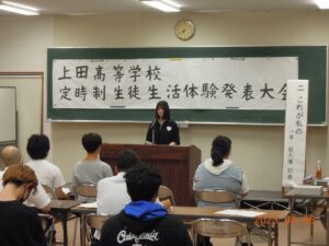 お知らせ 2023.09.08 お知らせ定時制 『校内生活体験発表大会』開催される【定時制】 去る9月6日(水)定時制のメインイベントの一つ『校内生活体験発表大会』が開催されました。夏休み明けから全員で取り組み書き上げた作文の中から7名の代表者が発表。学校生活を軸に紆余曲折をへて今に至る様子を、それぞれの持ち味を出して読み上げ披露してくれました。その中から最も共感を集めた2人の作品が、9月15日(金)に『東信生活体験発表大会』で発表されます。 前の記事へ 一覧へ戻る 次の記事へ TOP すべてのお知らせ お知らせ 『校内生活体験発表大会』開催される【定時制】