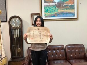 これは、「全国規模の大会等において、特に優秀な成績をおさめた児童生徒の皆さんの栄誉を讃える。」というもので、小原さんはスズキワールドカップ2023第34回エアロビック世界大会において、ジュニアミックスペア部門で5位という成績が評価されて学芸文化部門の個人の部で表彰されました。