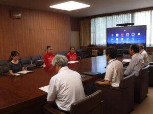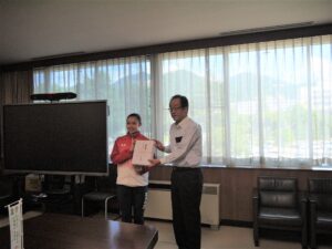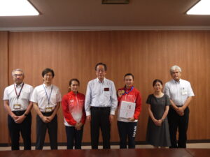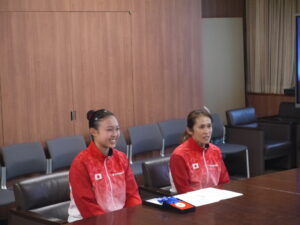 お知らせ 2024.08.02 お知らせ 8月1日(木)副知事表敬訪問 5月に行われたスズキワールドカップ2024第35回エアロビック世界大会ジュニアトリオ部門で優勝し、世界一になった2年生小原理子さんが、長野県の関副知事を表敬訪問して結果報告をしました。 副知事に大会の様子を動画でご覧いただき、「ピシッと3人が揃うところは本当にきれいですね。」と感心されていました。コーチからは、技の難易度を下げて着実に実施点で評価されることを狙ったなどの戦略も語られました。理子さんは、今後もシニア部門で競技を続けていくそうです。またいい報告ができるといいですね。 前の記事へ 一覧へ戻る 次の記事へ TOP すべてのお知らせ お知らせ 8月1日(木)副知事表敬訪問