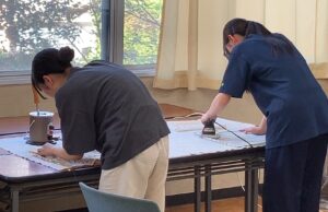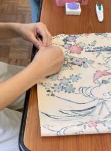 9月14日(土)午後、本校の探究的な学習(「GS」グローバルスタディーズ)で、上田紬をとおして「きもの文化」を広めるための活動をしている生徒3人が、活動の一環としてワークショップを開催しました。