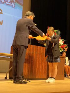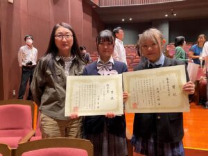 竹重さん、滝澤さんの順番に発表しましたが、準備が功を奏したか2人とも東信大会よりも落ち着いて自分の言葉で伝えるように発表することができました。後で審査員から教えていただきましたが、文章もさることながら2人は発表の態度がとても良く好感が持てたとのことでした。結果は竹重さんが優秀賞、滝澤さんが審査委員特別賞と2人揃って受賞することができました。